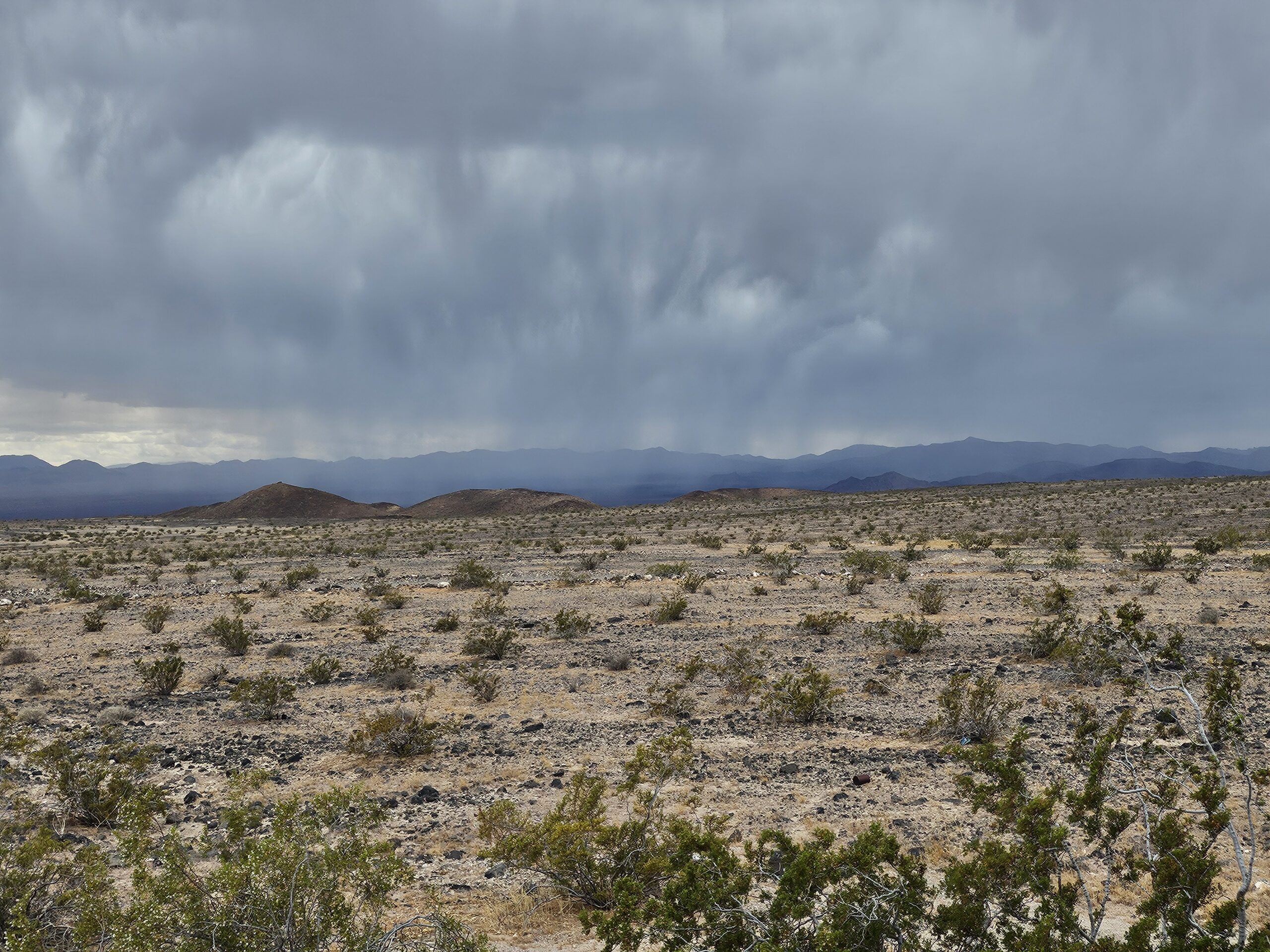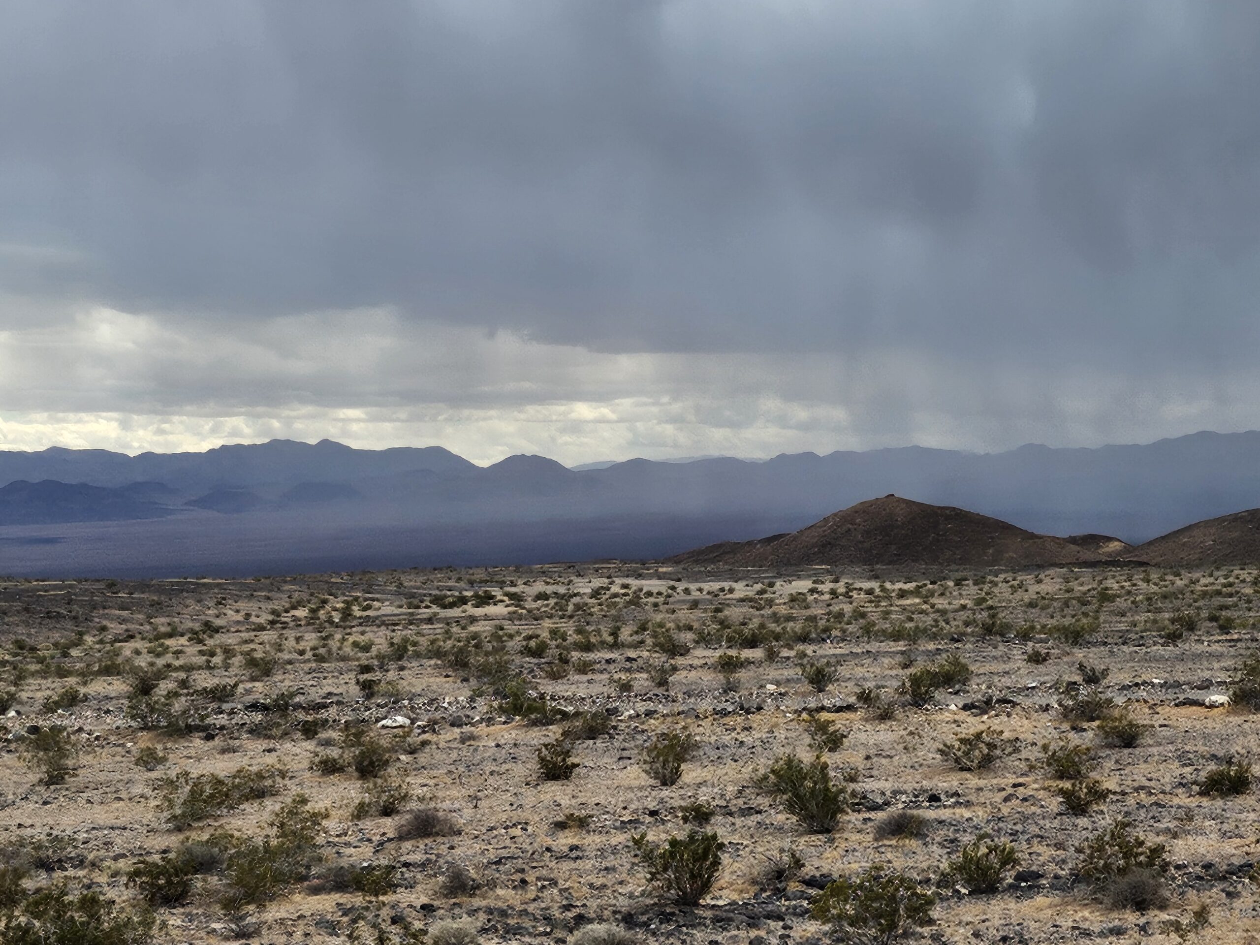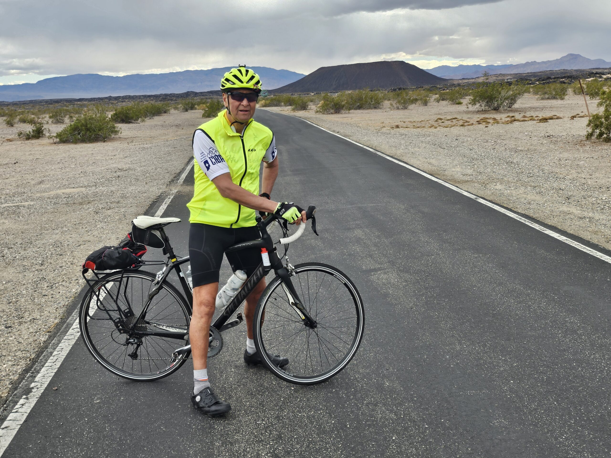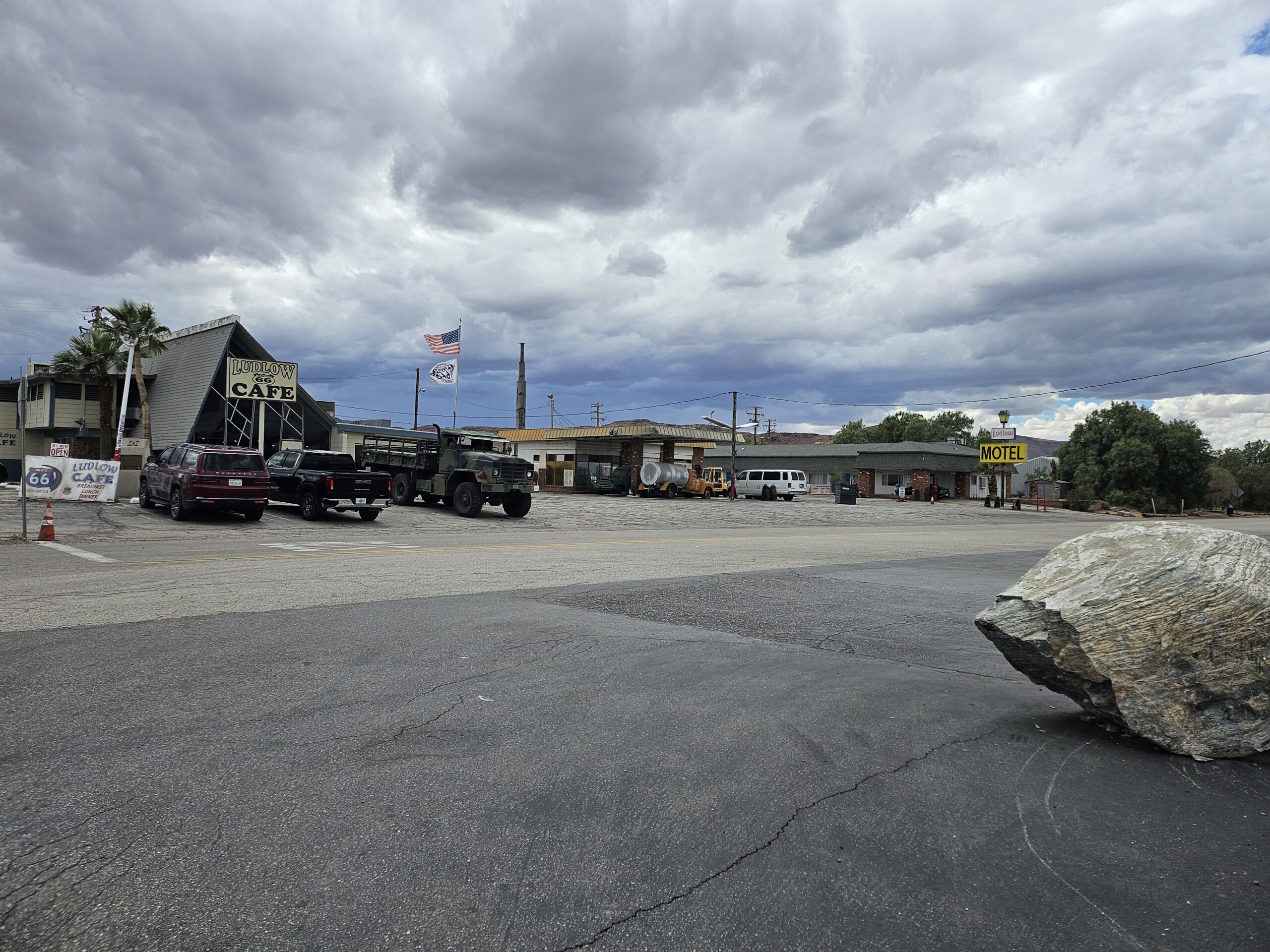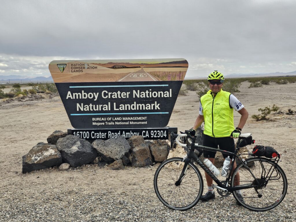 About 3 miles outside of Amboy, the storms had past over us. We were damp, but not soaked. At least we had made excellent time between the downhill slope and the string tailwinds. We made a quick photo op at the Amboy crater.