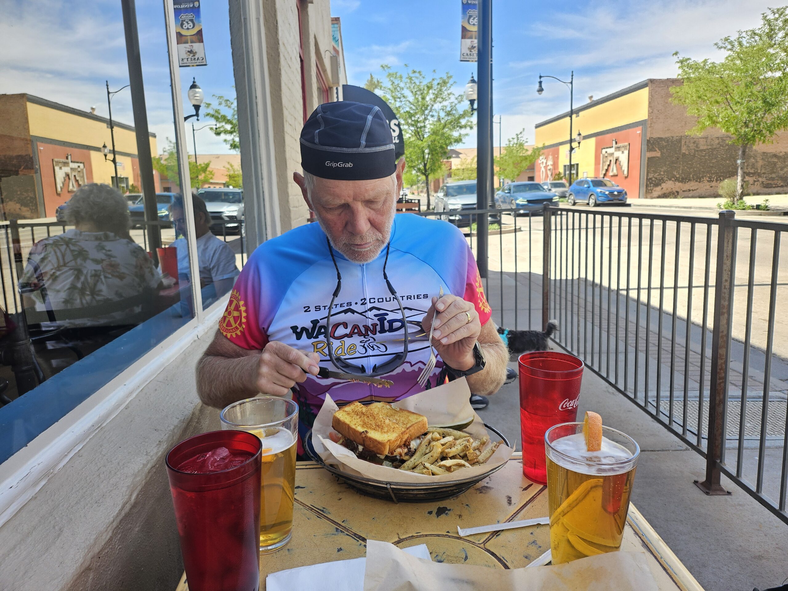 We felt better afterwards. Ron must have been feeling better than me because he got out at a fast clip and was way ahead of me before we made our own stop along the interstate. I led the way into Winslow and we saw our hotel not far from the first exit. We had made great time. So much that we were too early to officially check in. The staff person at the desk was kind enough to let us leave our panniers with them for safe keeping. We each fished out our regular shoes and a couple of essentials that we could put into a string bag strapped to our racks. Then we headed for the heart of old Winslow for lunch.