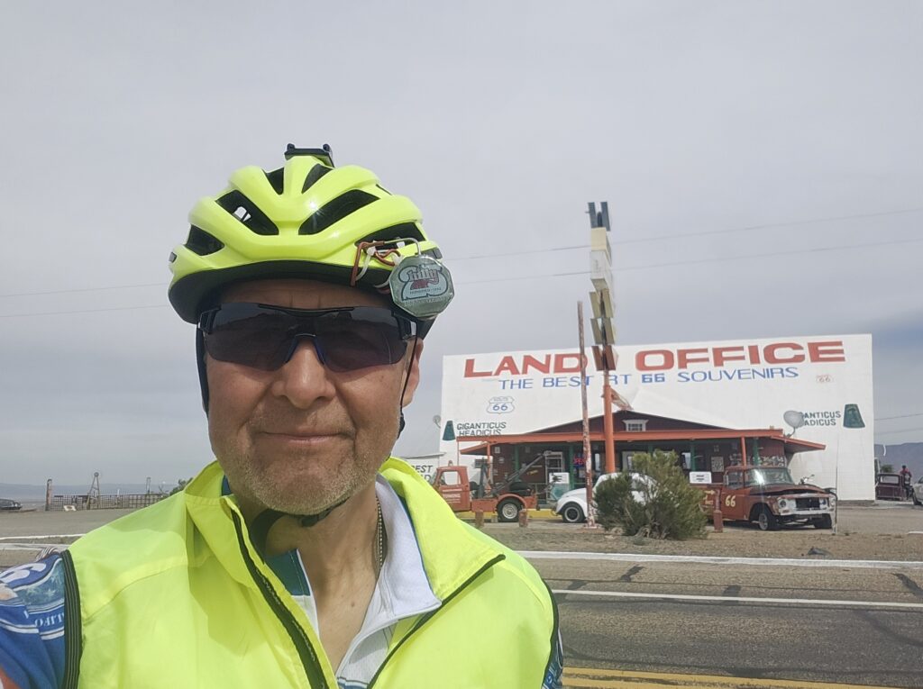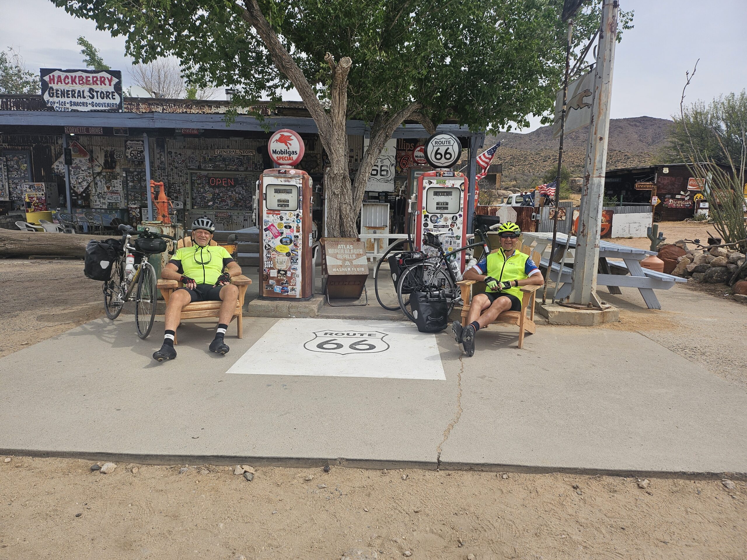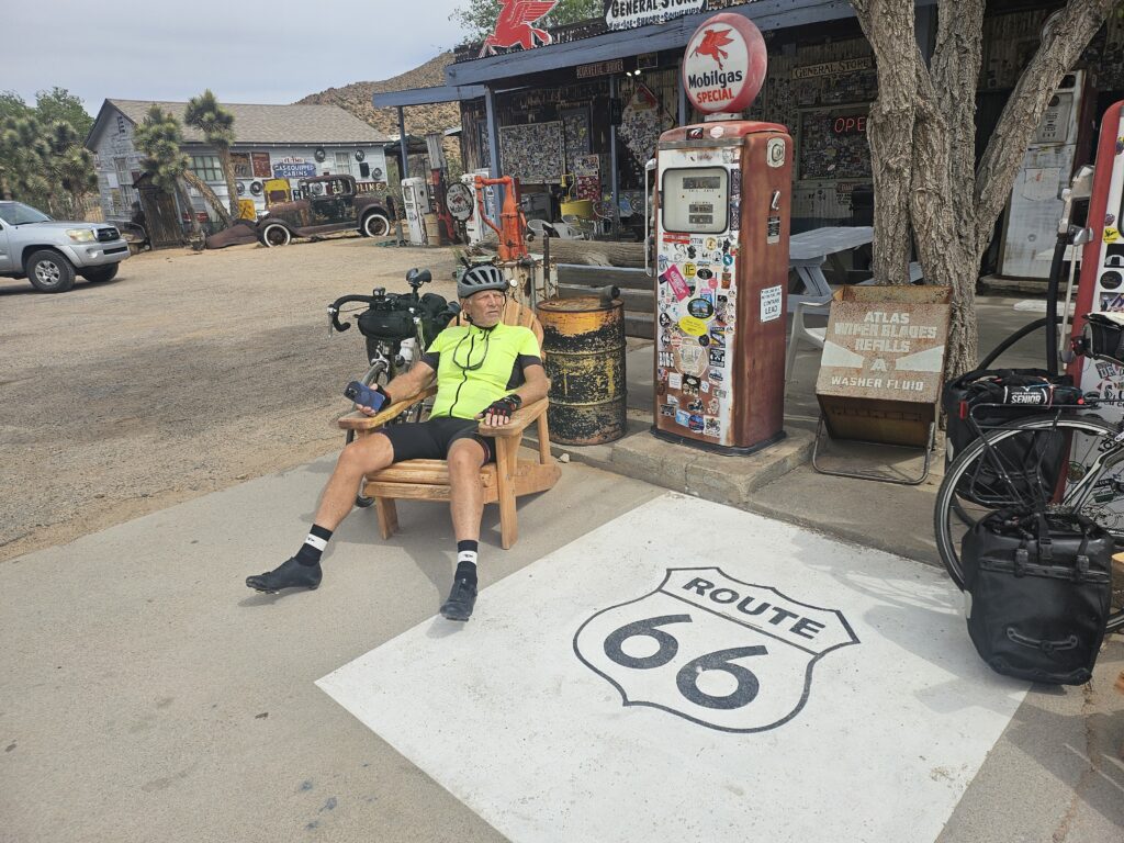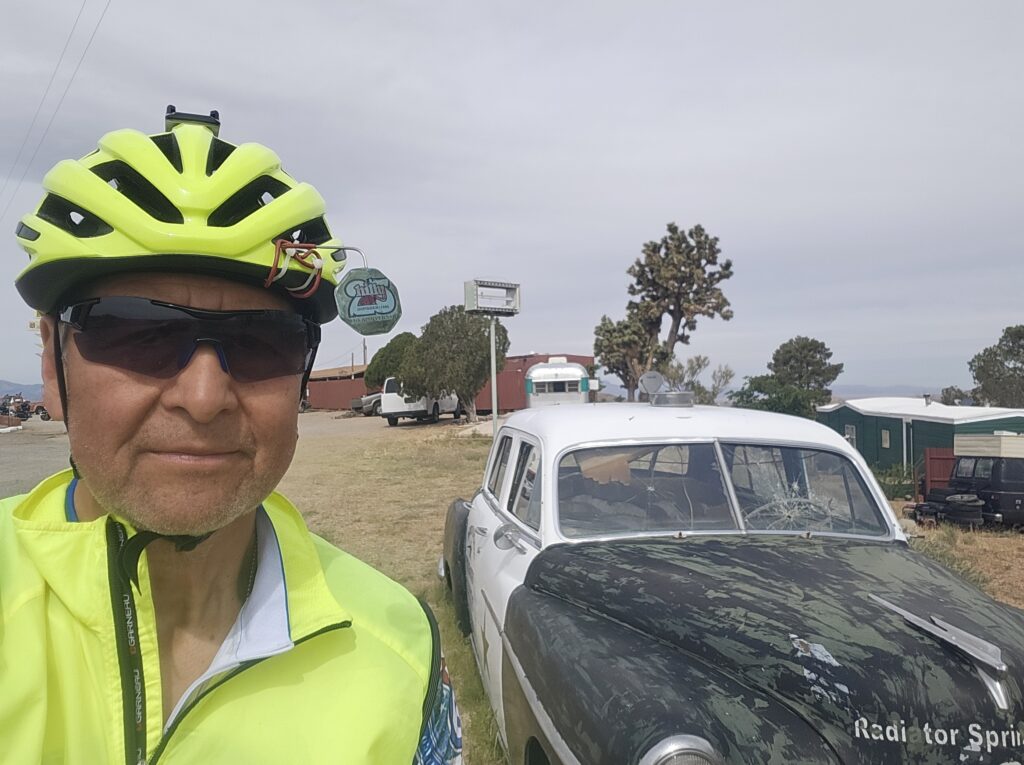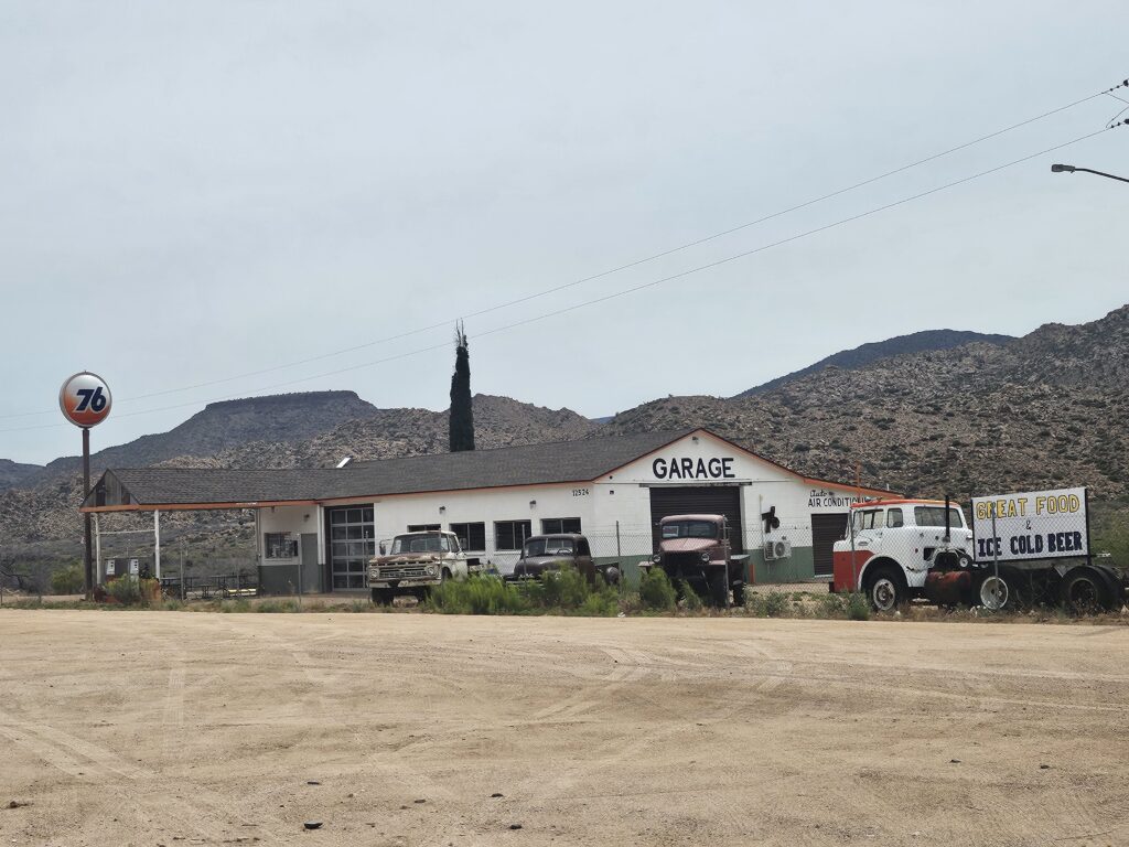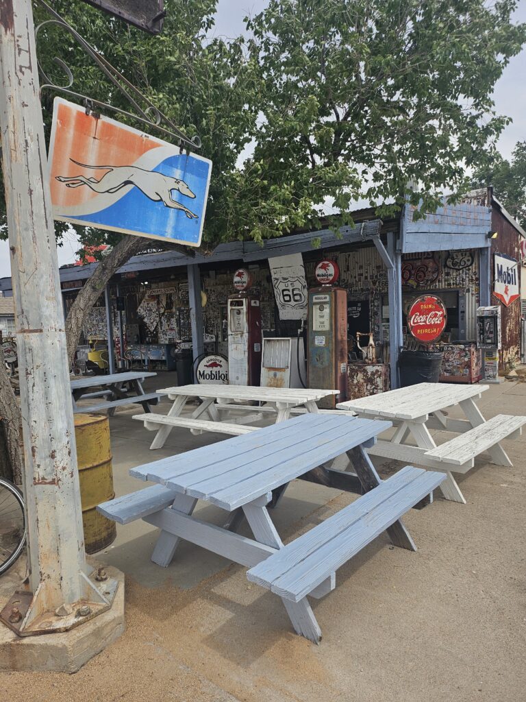 The climb got a little steeper and it seemed like it took forever to get to Hackberry. It was windy, but it wasn’t at our back. Luckily, it wasn’t a headwind, either. I’m sure there were homes somewhere nearby, but the only thing we saw was the General Store. Ron asked the lady working the counter if there was anything labeled Route 66 that you could not find here. She said, “I don’t think so!”