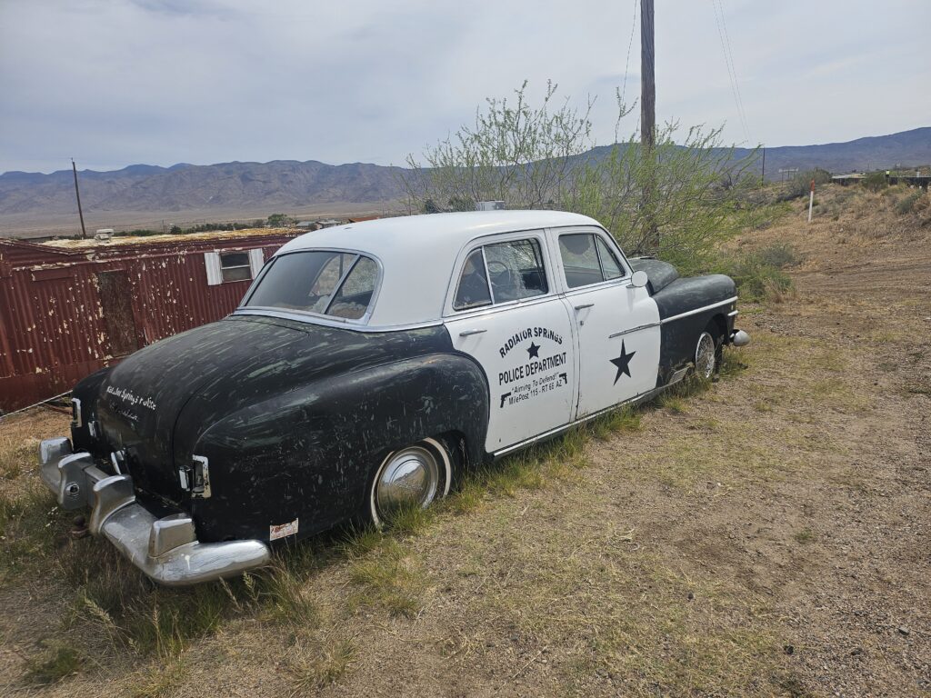 It hadn’t been difficult, but we had been going uphill for 8 miles and decided to take advantage of a gas station 16 miles in before the next available facilities 20 miles away. The first attraction that caught our eye was in Antares. Understand that most of the “towns” named along today”s stretch of Route 66 have no central marking that distinguishes them as a town. Antares had the remains of a gas station. I’m blocking the view of their “Easter Island” statue, Giganticus Headicus. Just pretend my head is his. I liked the old Police car. [By the way, you can click on thee pictures to get a better view]