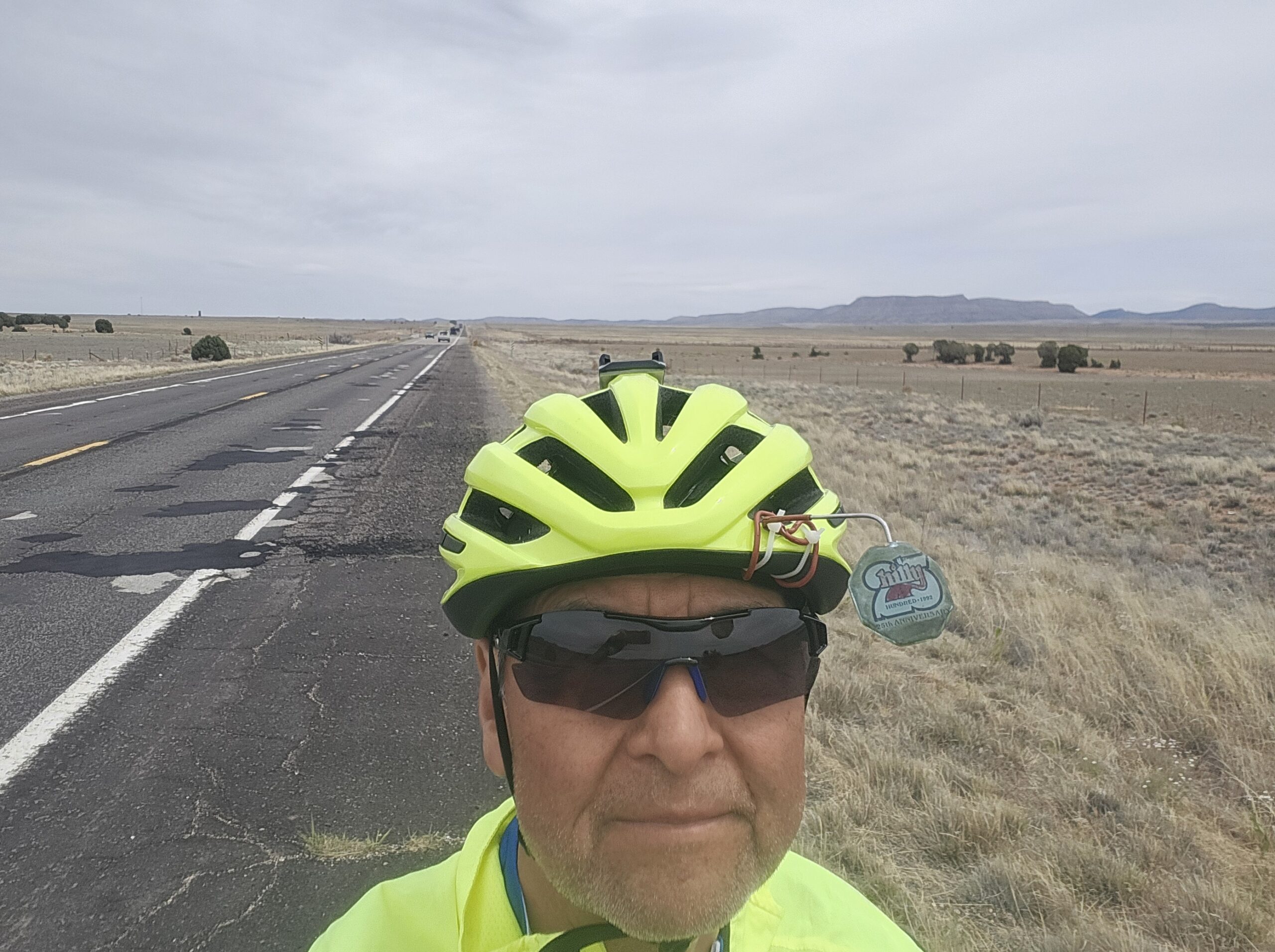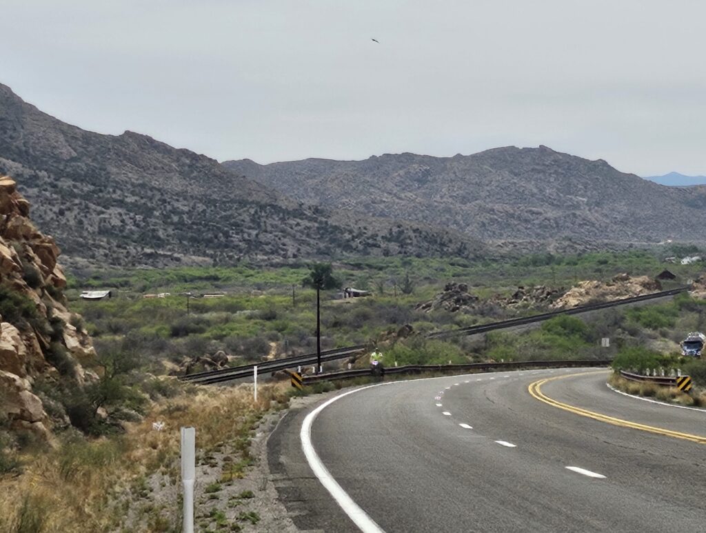 It was a long day in both climbing and time yesterday and today was going to be climbing without the grade, but even more distance. The target route to Seligman was about 83 miles. There were no shorter alternatives. We rose to a cool, partly sunny day. The road gave us a good shoulder. The trucks were respectful and the passenger cars and trucks were less so.