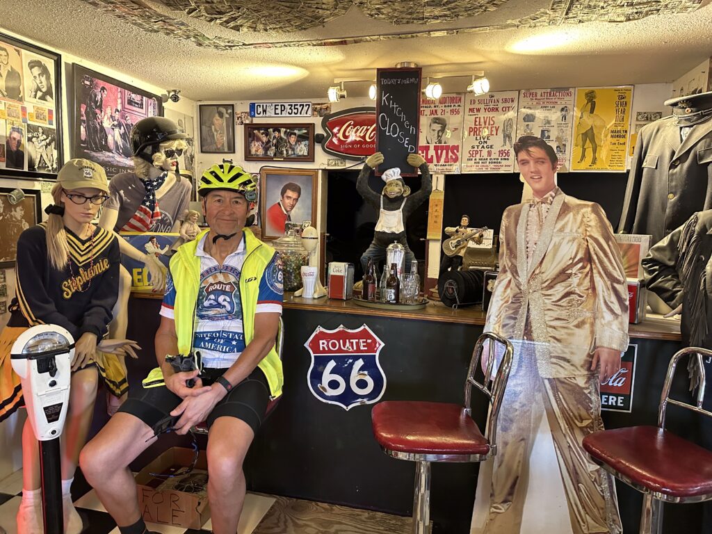 The whole turn of events turned out to be a blessing in disguise. We were pretty worn from so many long days in a row, so we needed the break. Today, we didn’t get any rain, I got a free milk shake, and we saw a lot of relics from the past that make Route 66 a legend. Details of the route are here. And a 3D view is here.