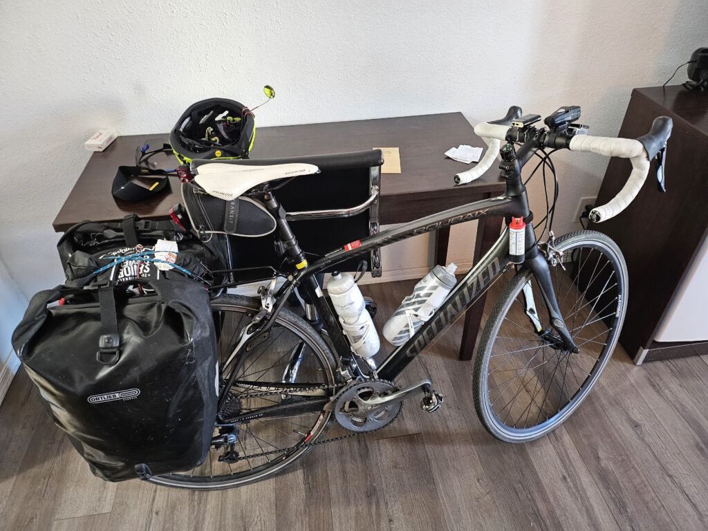 Maybe it was because we were carrying our panniers, maybe it was the hottest day so far and the most climbing, but the 62 miles took us longer than any day so far. The shortest mileage day gave us the most saddle time. Details of the ride are here.