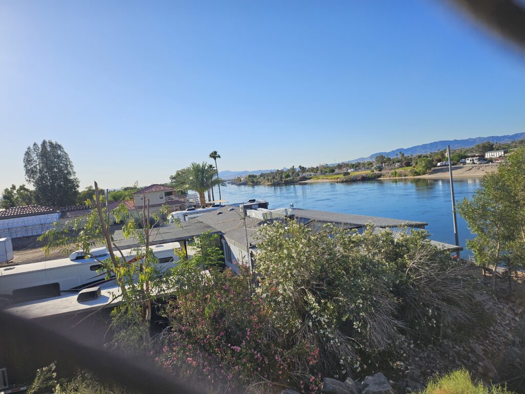 The Red Roof Inn where we stayed had a terrible Wifi service. The blog the first night took me 3 hours because thee internet connection would drop or lose its signal level. It would take 5 minutes to save a draft, even if I only added a little change. Today we were hoping to get a quick “continental breakfast”. Based on yesterdays offerings, I had bought a breakfast burrito at the gas station across the street, so I could have something beside a PBJ sandwich. We waited until almost 7:30 for them to open the 7:00 breakfast. The door to the lobby was locked and no one answered the phone at the front desk. By 7:40 we were on the road heading across the Colorado River into Arizona.
