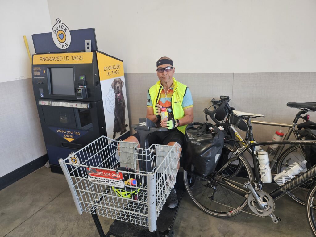Ron had some left over pizza from his dinner last night, but really needed more to drink. So, we stopped at a Walmart 10 miles outside of Needles. We brought our bikes inside the cart area. I decided to get a sorry excuse for second breakfast – Strawberry milk and a banana to have with my own trail mix.