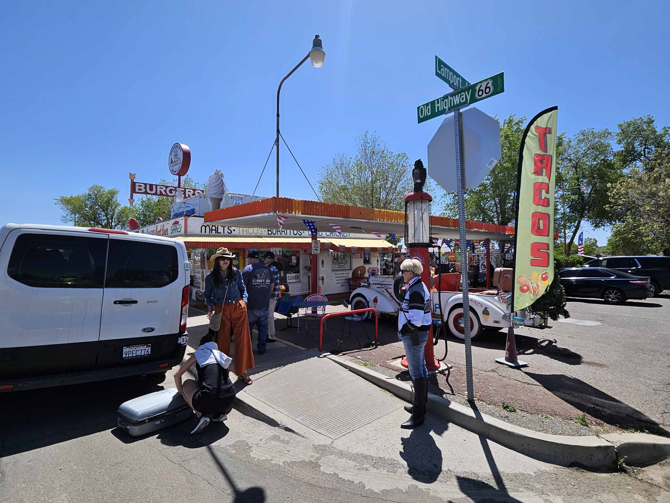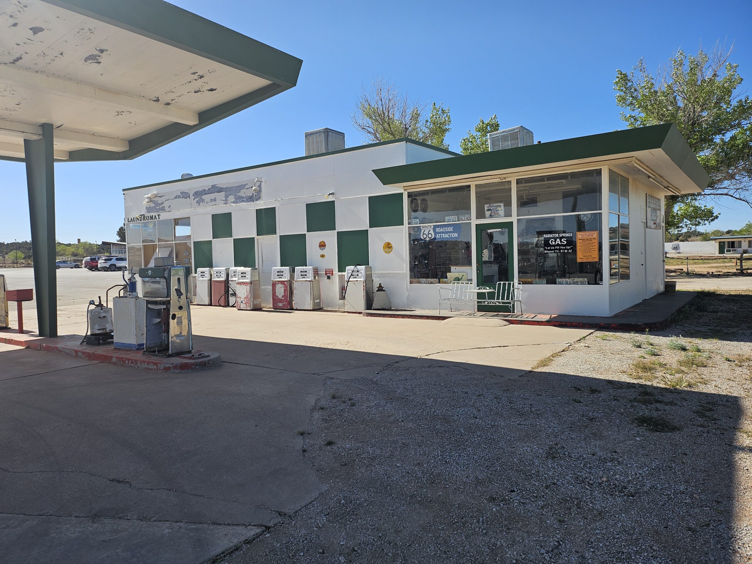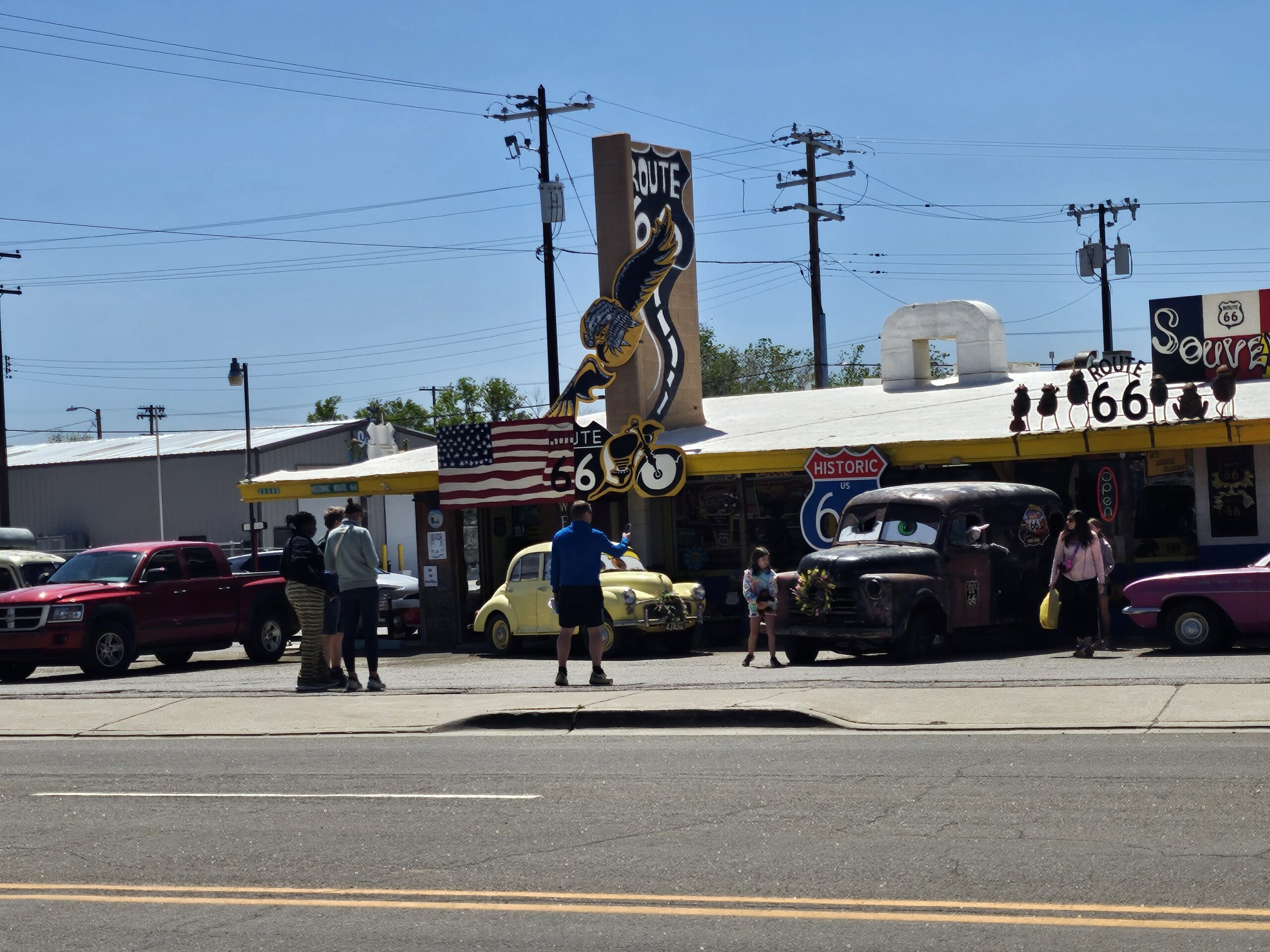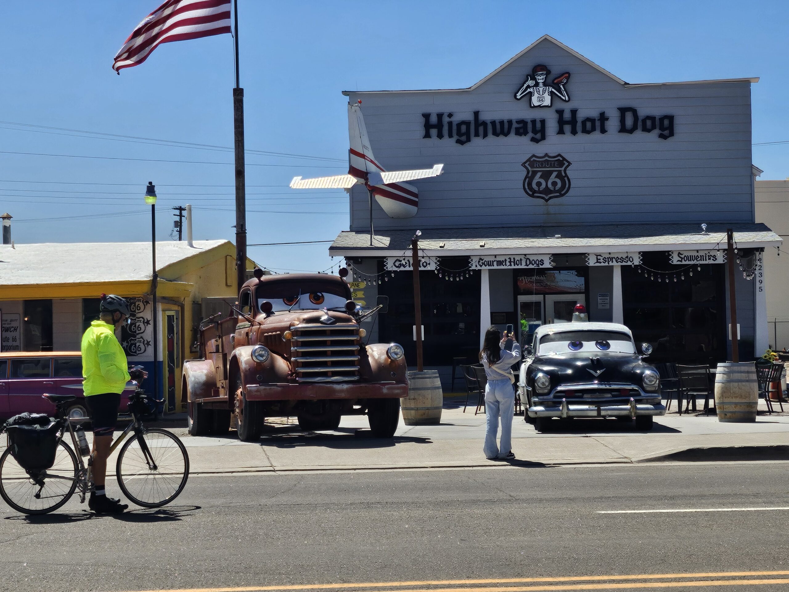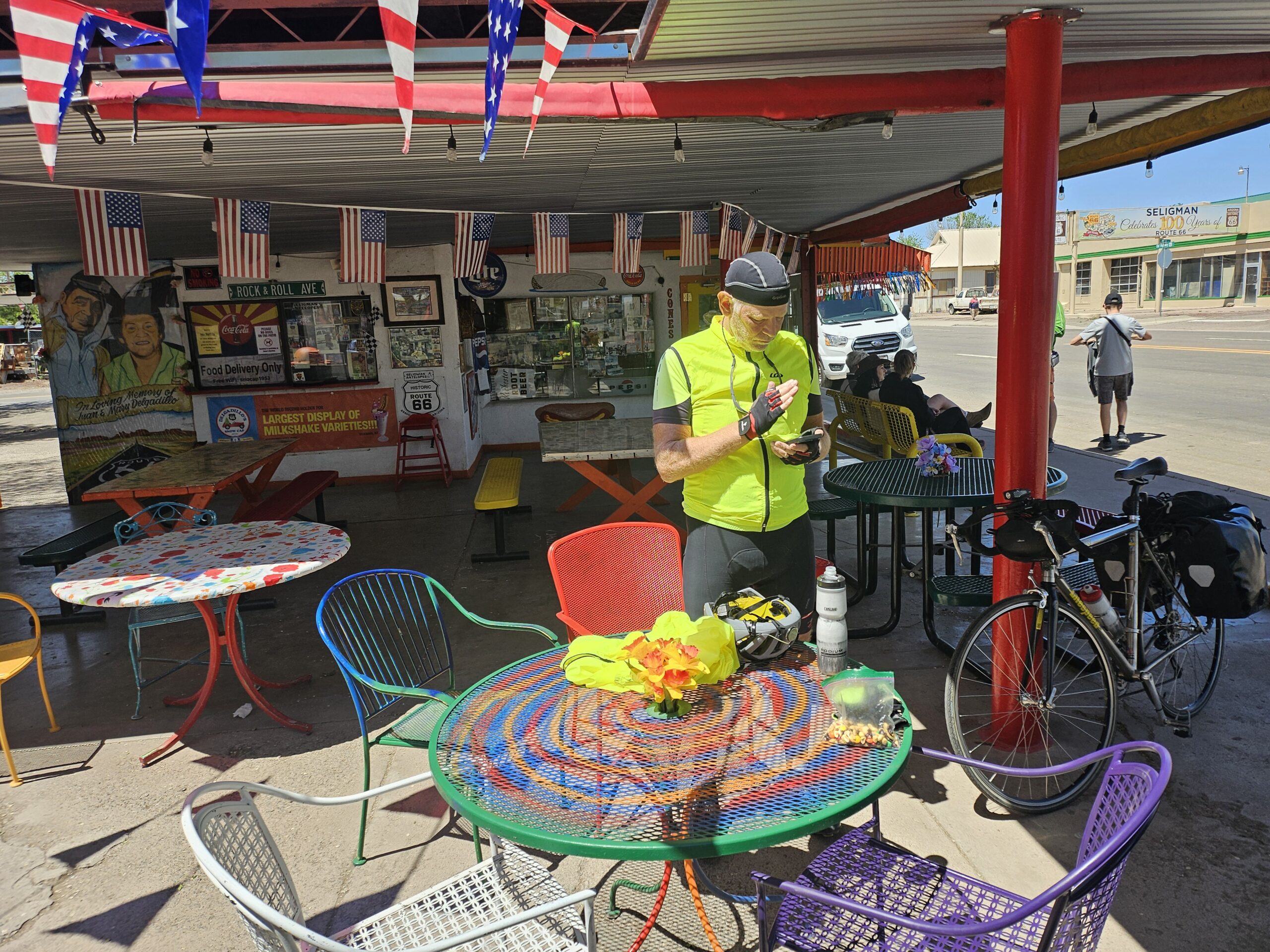 Our first rest stop after climbing 12 miles out of Peach Springs was at a cafe near a museum piece gas station. We got a snack for the road.