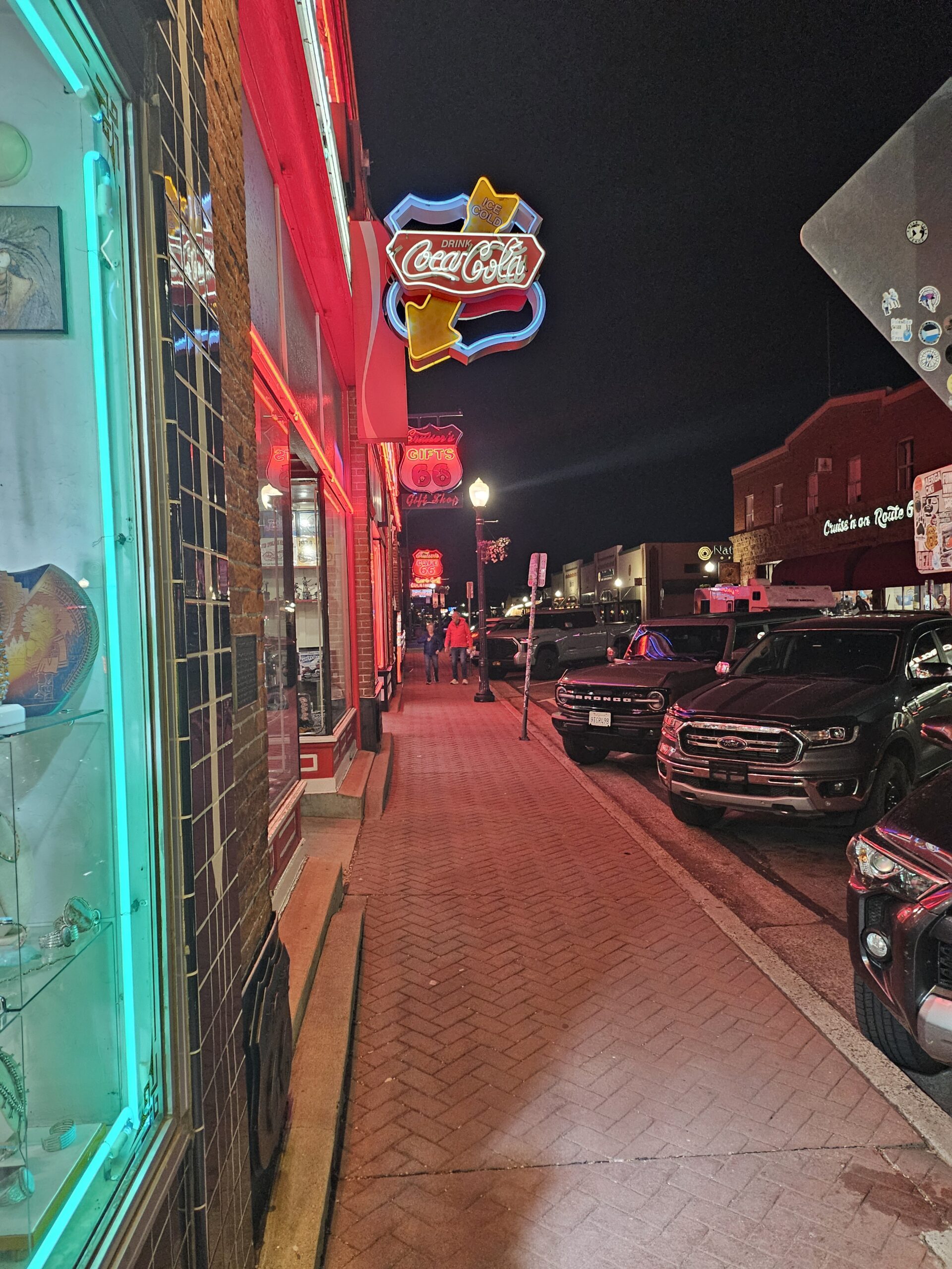 We had passed a lot of very cool places and exhibits as we made our way to the hotel, but didn’t get a chance to explore. After cleaning up we walked back through town to grab ice cream. It was already dark. So ended the longest (time wise) day of the trip. With everything shut down in Seligman, our itinerary changes and some bike gear shifting problems Ron developed, we had plenty of adventure today. Tomorrow is a short ride to Flagstaff, get Ron’s bike tuned, and maybe take another look at Williams before we go. It’s an adventure. I accidentally stopped my GPS, so my stats are in 2 parts – here and here.